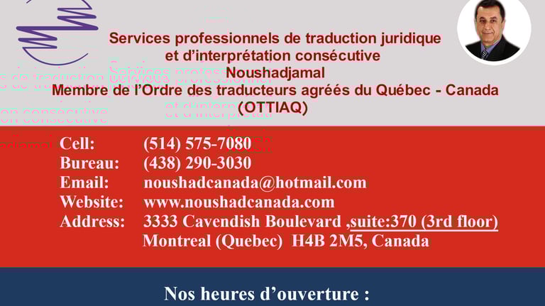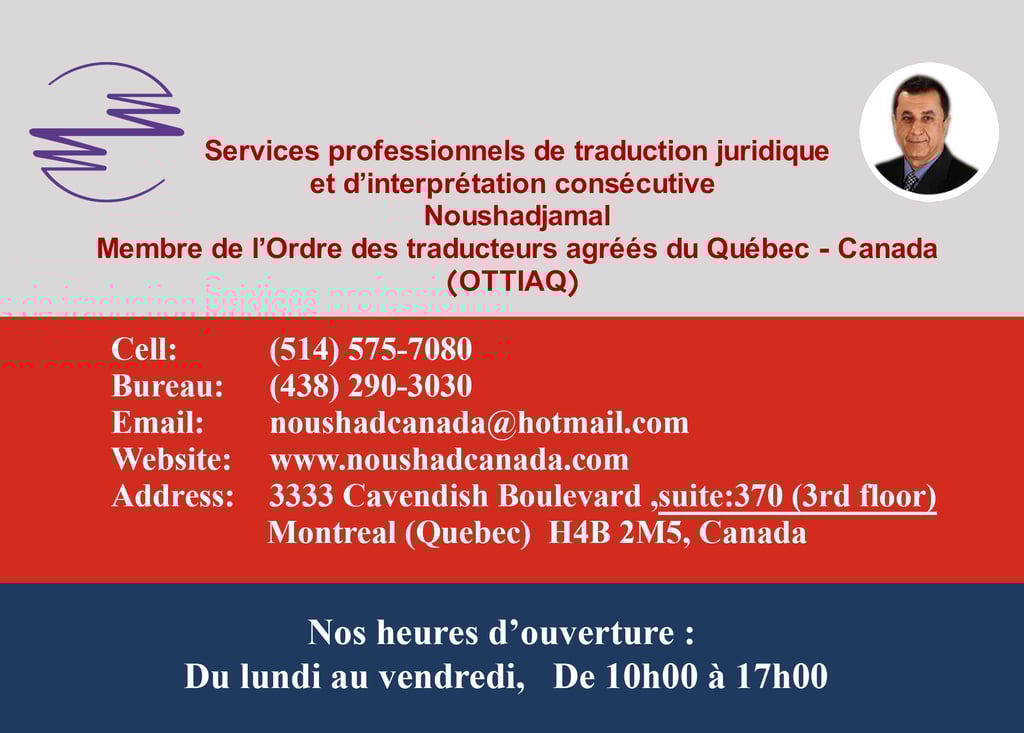 La force distinctive de M. Mohammad Reza NOUSHADJAMAL réside dans la combinaison de ses compétences linguistiques, de sa compréhension approfondie des textes juridiques et administratifs, ainsi que de son approche professionnelle et humaine envers ses clients. Par son engagement, sa ponctualité et son parcours remarquable, il a su gagner, au fil des décennies, la confiance et le respect de la communauté iranienne et d’une clientèle internationale à Montréal et dans d’autres villes canadiennes.